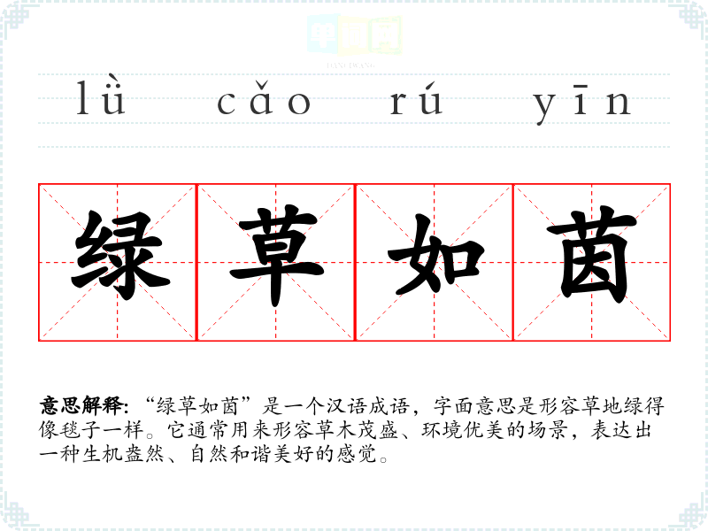 “绿草如茵”是一个汉语成语,字面意思是形容草地绿得像毯子一样。它通常用来形容草木茂盛、环境优美的场景,表达出一种生机盎然、自然和谐美好的感觉。