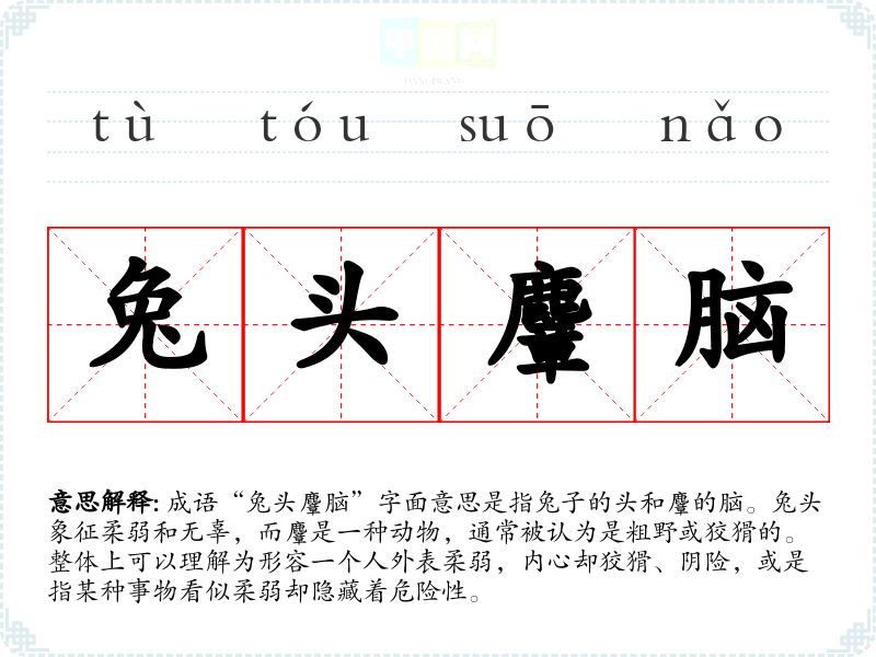 成语“兔头麞脑”字面意思是指兔子的头和麞的脑。兔头象征柔弱和无辜,而麞是一种动物,通常被认为是粗野或狡猾的。整体上可以理解为形容一个人外表柔弱,内心却狡猾、阴险,或是指某种事物看似柔弱却隐藏着危险性。