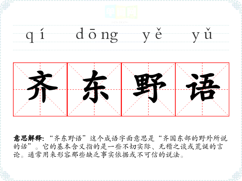 “齐东野语”这个成语字面意思是“齐国东部的野外所说的话”。它的基本含义指的是一些不切实际、无稽之谈或荒诞的言论。通常用来形容那些缺乏事实依据或不可信的说法。