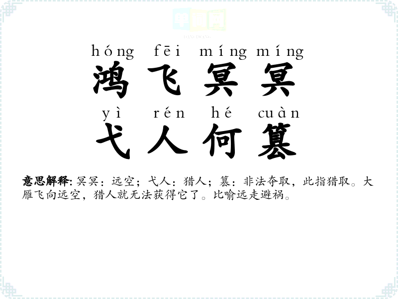| 鸿飞冥冥,弋人何篡 | 冥冥:远空;弋人:猎人;篡:非法夺取,此指猎取。大雁飞向远空,猎人就无法获得它了。比喻远走避祸。 |
