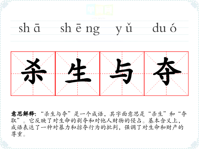 “杀生与夺”是一个成语,其字面意思是“杀生”和“夺取”。它反映了对生命的剥夺和对他人财物的侵占。基本含义上,成语表达了一种对暴力和掠夺行为的批判,强调了对生命和财产的尊重。