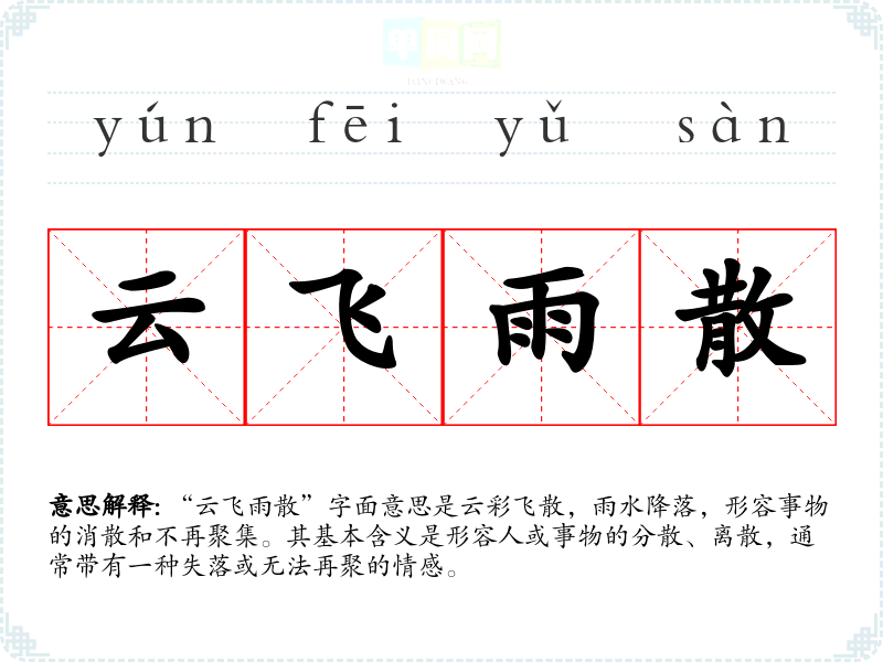 “云飞雨散”字面意思是云彩飞散,雨水降落,形容事物的消散和不再聚集。其基本含义是形容人或事物的分散、离散,通常带有一种失落或无法再聚的情感。