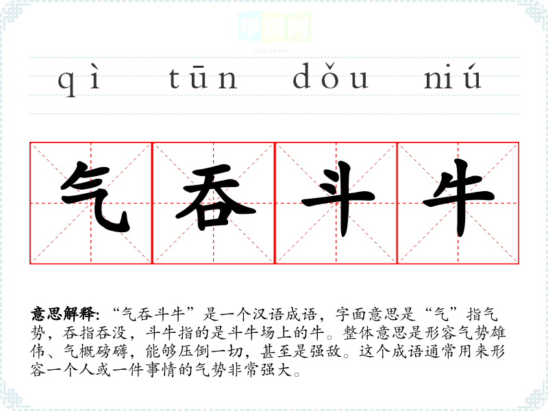 “气吞斗牛”是一个汉语成语,字面意思是“气”指气势,吞指吞没,斗牛指的是斗牛场上的牛。整体意思是形容气势雄伟、气概磅礴,能够压倒一切,甚至是强敌。这个成语通常用来形容一个人或一件事情的气势非常强大。