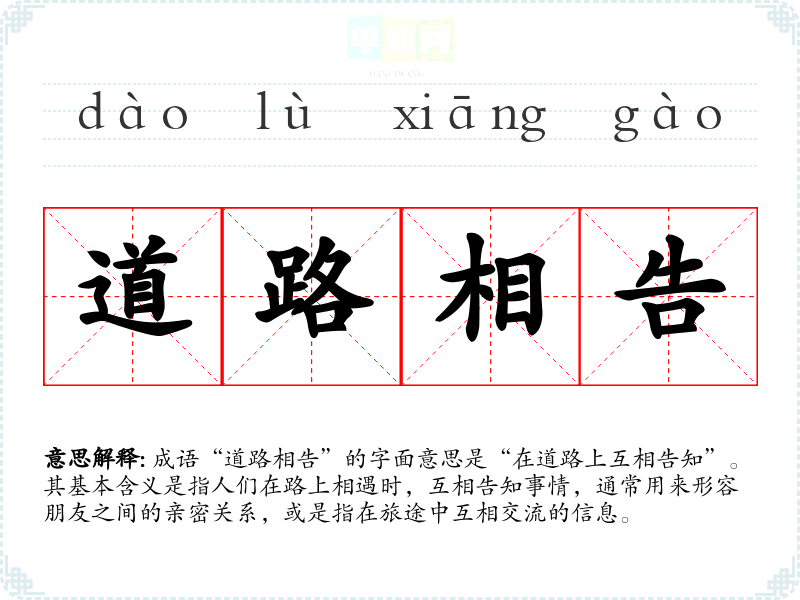 “道路相告”让我联想到与朋友之间的深厚情谊和分享的快乐。在快节奏的生活中,人与人之间的真实交流显得尤为珍贵。这个成语让我明白,沟通不仅是信息的传递,更是情感的分享。