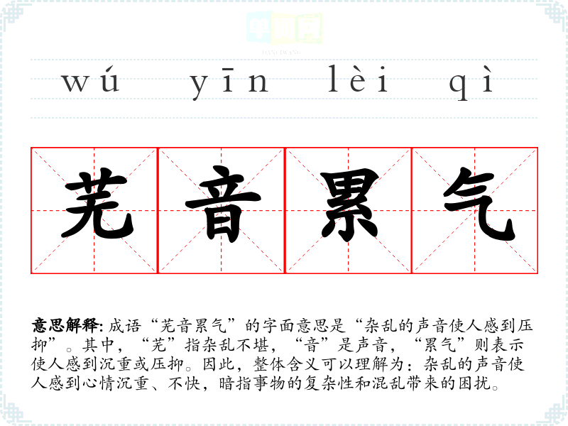 成语“芜音累气”的字面意思是“杂乱的声音使人感到压抑”。其中,“芜”指杂乱不堪,“音”是声音,“累气”则表示使人感到沉重或压抑。因此,整体含义可以理解为:杂乱的声音使人感到心情沉重、不快,暗指事物的复杂性和混乱带来的困扰。