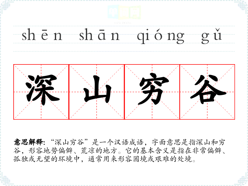 “深山穷谷”是一个汉语成语,字面意思是指深山和穷谷,形容地势偏僻、荒凉的地方。它的基本含义是指在非常偏僻、孤独或无望的环境中,通常用来形容困境或艰难的处境。