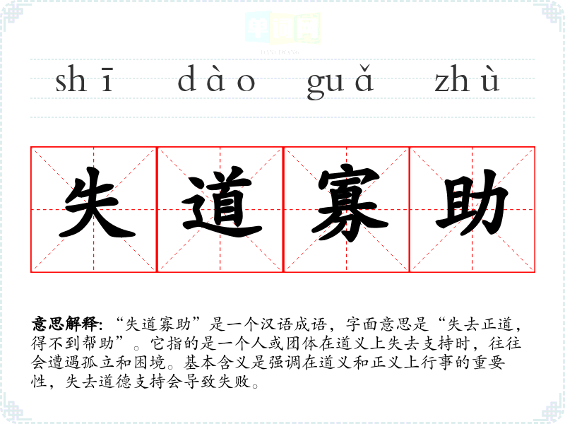 “失道寡助”是一个汉语成语,字面意思是“失去正道,得不到帮助”。它指的是一个人或团体在道义上失去支持时,往往会遭遇孤立和困境。基本含义是强调在道义和正义上行事的重要性,失去道德支持会导致失败。