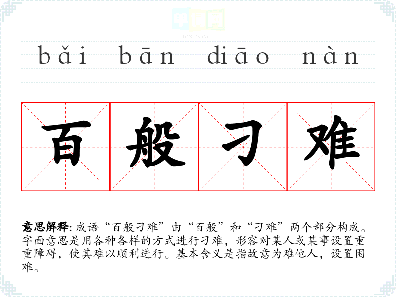 成语“百般刁难”由“百般”和“刁难”两个部分构成。字面意思是用各种各样的方式进行刁难,形容对某人或某事设置重重障碍,使其难以顺利进行。基本含义是指故意为难他人,设置困难。