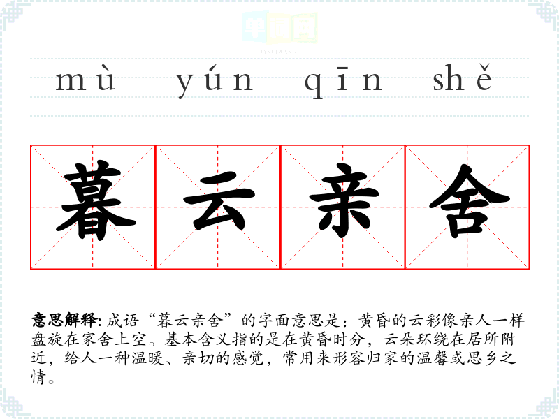 | 暮云亲舍 | 亲:父母,亲人;舍:居所。比喻客居他乡,思念亲人。 |