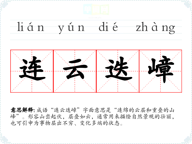成语“连云迭嶂”字面意思是“连绵的云层和重叠的山峰”。形容山峦起伏,层叠如云,通常用来描绘自然景观的壮丽,也可引申为事物层出不穷、变化多端的状态。