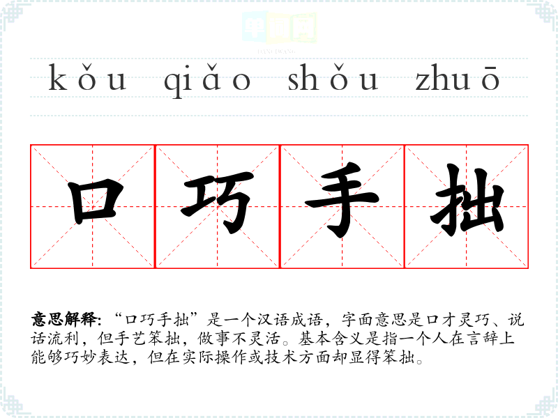 “口巧手拙”是一个汉语成语,字面意思是口才灵巧、说话流利,但手艺笨拙,做事不灵活。基本含义是指一个人在言辞上能够巧妙表达,但在实际操作或技术方面却显得笨拙。