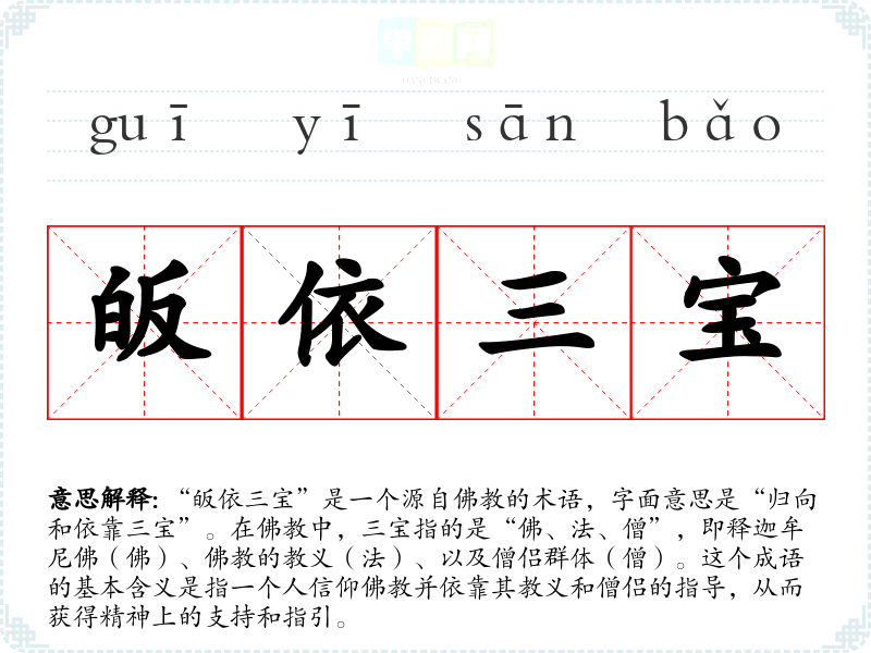 “皈依三宝”是一个源自的术语,字面意思是“归向和依靠三宝”。在中,三宝指的是“佛、法、僧”,即释迦牟尼佛(佛)、的教义(法)、以及僧侣群体(僧)。这个成语的基本含义是指一个人信仰并依靠其教义和僧侣的指导,从而获得精神上的支持和指引。