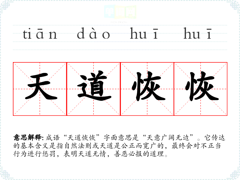 成语“天道恢恢”字面意思是“天意广阔无边”。它传达的基本含义是指自然法则或天道是公正而宽广的,最终会对不正当行为进行惩罚,表明天道无情,善恶必报的道理。