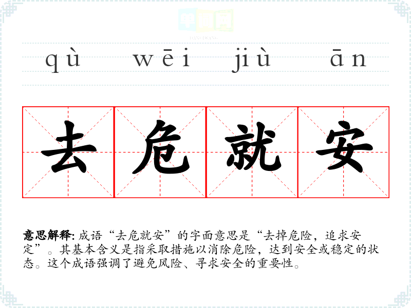 成语“去危就安”的字面意思是“去掉危险,追求安定”。其基本含义是指采取措施以消除危险,达到安全或稳定的状态。这个成语强调了避免风险、寻求安全的重要性。
