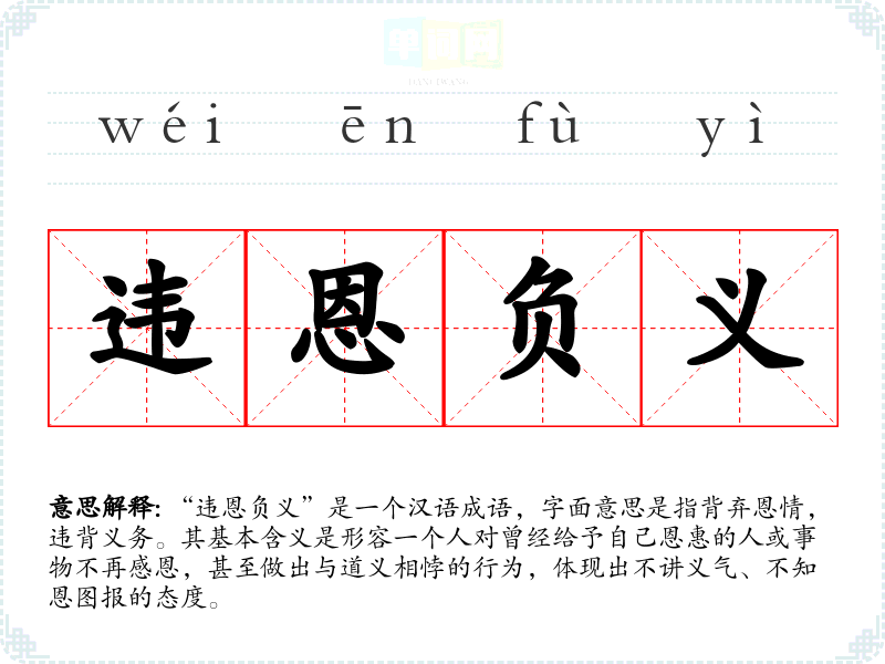 “违恩负义”是一个汉语成语,字面意思是指背弃恩情,违背义务。其基本含义是形容一个人对曾经给予自己恩惠的人或事物不再感恩,甚至做出与道义相悖的行为,体现出不讲义气、不知恩图报的态度。