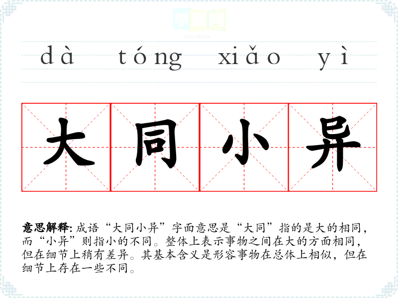 成语“大同小异”字面意思是“大同”指的是大的相同,而“小异”则指小的不同。整体上表示事物之间在大的方面相同,但在细节上稍有差异。其基本含义是形容事物在总体上相似,但在细节上存在一些不同。