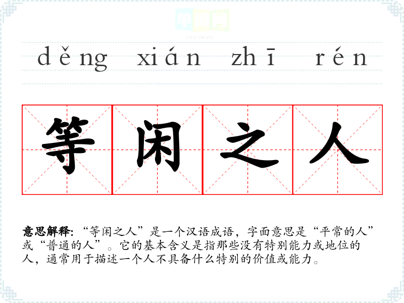 “等闲之人”是一个汉语成语,字面意思是“平常的人”或“普通的人”。它的基本含义是指那些没有特别能力或地位的人,通常用于描述一个人不具备什么特别的价值或能力。