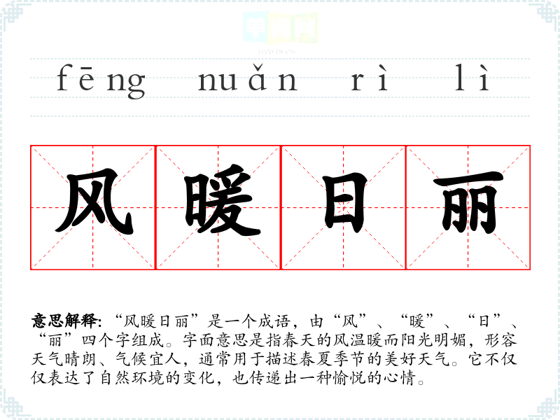 “风暖日丽”并没有明确的历史典故来源,但可以推测其形象的描绘与古代文人对自然的热爱和歌颂有关。**古代诗词中常常描写自然景色,尤其是春天的美好,体现了文人对生活的热情与向往。