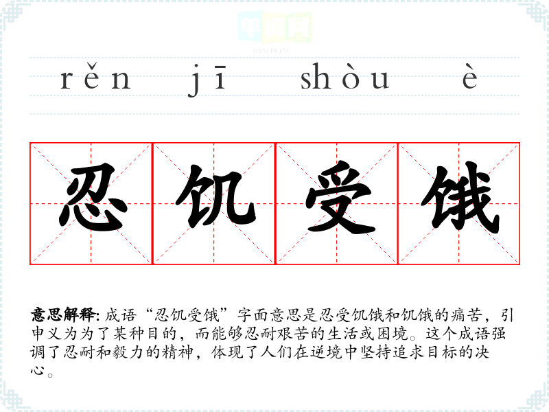 - 演讲:在激励他人的演讲中,常提到“忍饥受饿”来鼓舞人们在追求目标时要有毅力和耐心。