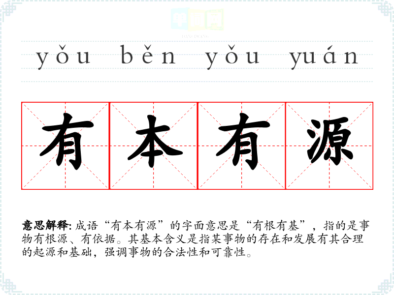 成语“有本有源”的字面意思是“有根有基”,指的是事物有根源、有依据。其基本含义是指某事物的存在和发展有其合理的起源和基础,强调事物的合法性和可靠性。