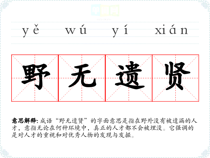 成语“野无遗贤”的字面意思是指在野外没有被遗漏的人才,意指无论在何种环境中,真正的人才都不会被埋没。它强调的是对人才的重视和对优秀人物的发现与发掘。