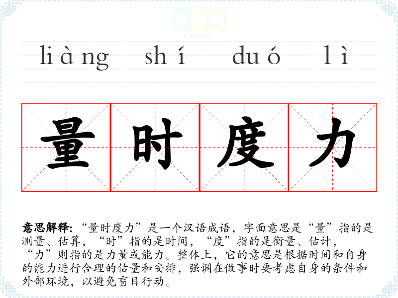 “量时度力”是一个汉语成语,字面意思是“量”指的是测量、估算,“时”指的是时间,“度”指的是衡量、估计,“力”则指的是力量或能力。整体上,它的意思是根据时间和自身的能力进行合理的估量和安排,强调在做事时要考虑自身的条件和外部环境,以避免盲目行动。