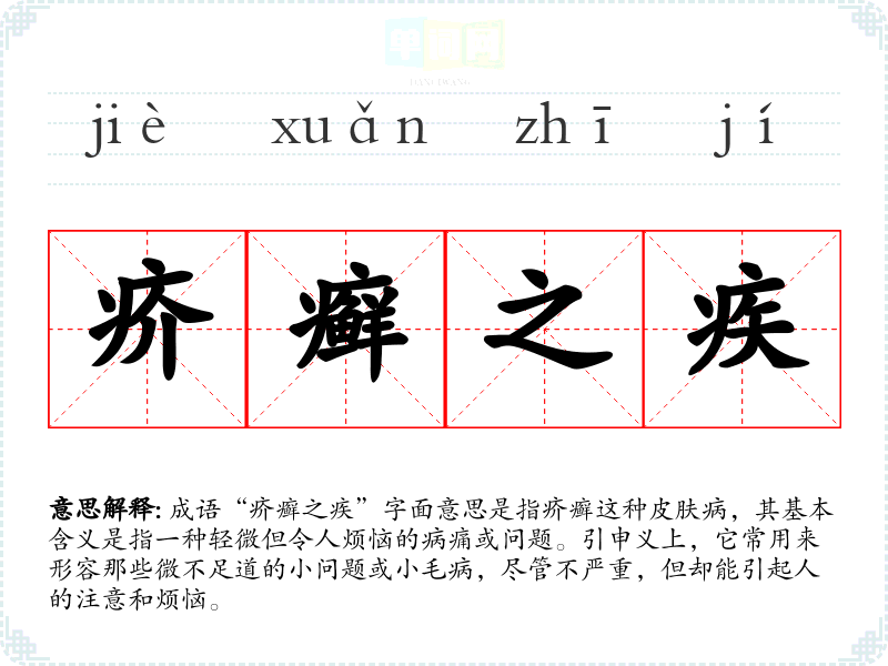 成语“疥癣之疾”字面意思是指疥癣这种皮肤病,其基本含义是指一种轻微但令人烦恼的病痛或问题。引申义上,它常用来形容那些微不足道的小问题或小毛病,尽管不严重,但却能引起人的注意和烦恼。