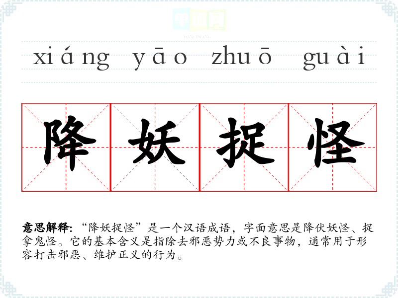 “降妖捉怪”是一个汉语成语,字面意思是降伏妖怪、捉拿鬼怪。它的基本含义是指除去邪恶势力或不良事物,通常用于形容打击邪恶、维护正义的行为。