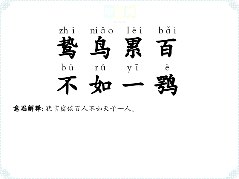 | 鸷鸟累百,不如一鹗 | 犹言诸侯百人不如天子一人。 |