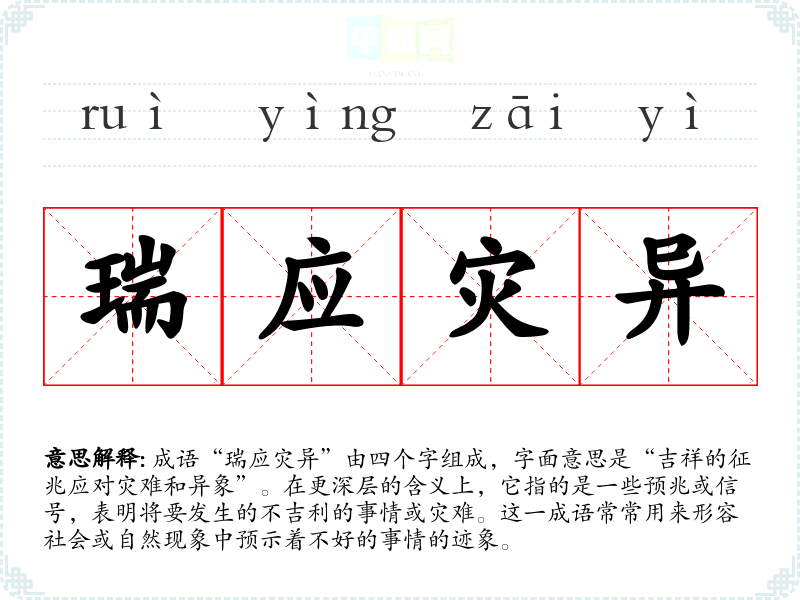 成语“瑞应灾异”由四个字组成,字面意思是“吉祥的征兆应对灾难和异象”。在更深层的含义上,它指的是一些预兆或信号,表明将要发生的不吉利的事情或灾难。这一成语常常用来形容社会或自然现象中预示着不好的事情的迹象。