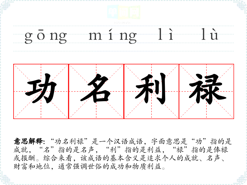“功名利禄”是一个汉语成语,字面意思是“功”指的是成就,“名”指的是名声,“利”指的是利益,“禄”指的是俸禄或报酬。综合来看,该成语的基本含义是追求个人的成就、名声、财富和地位,通常强调世俗的成功和物质利益。