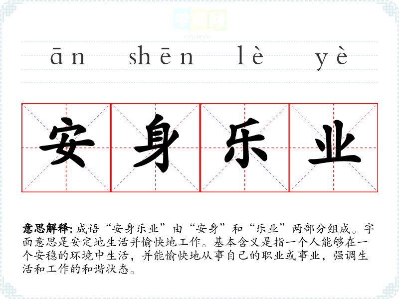 成语“安身乐业”由“安身”和“乐业”两部分组成。字面意思是安定地生活并愉快地工作。基本含义是指一个人能够在一个安稳的环境中生活,并能愉快地从事自己的职业或事业,强调生活和工作的和谐状态。