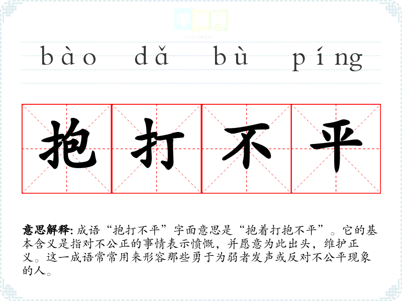 成语“抱打不平”字面意思是“抱着打抱不平”。它的基本含义是指对不公正的事情表示愤慨,并愿意为此出头,维护正义。这一成语常常用来形容那些勇于为弱者发声或反对不公平现象的人。