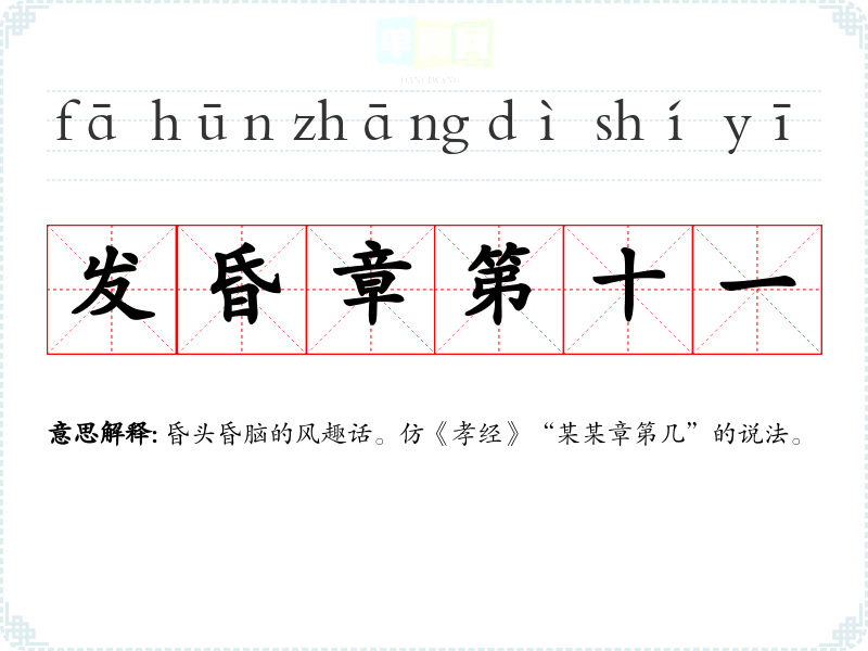 | 发昏章第十一 | 昏头昏脑的风趣话。仿《孝经》“某某章第几”的说法。 |