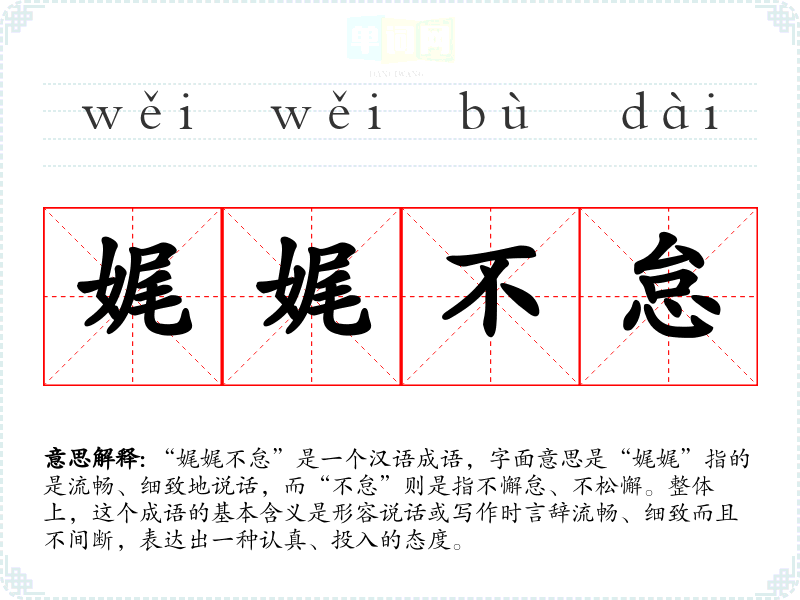 “娓娓不怠”是一个汉语成语,字面意思是“娓娓”指的是流畅、细致地说话,而“不怠”则是指不懈怠、不松懈。整体上,这个成语的基本含义是形容说话或写作时言辞流畅、细致而且不间断,表达出一种认真、投入的态度。