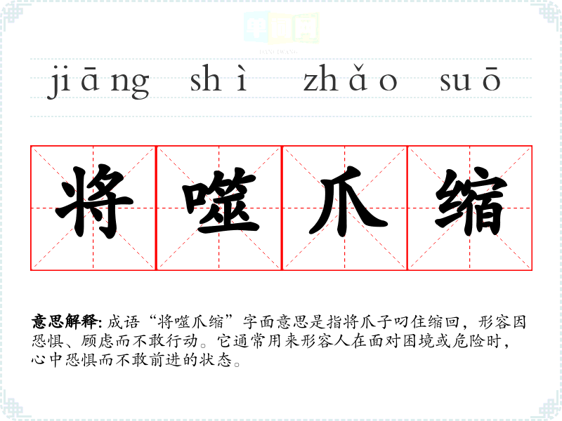 成语“将噬爪缩”字面意思是指将爪子叼住缩回,形容因恐惧、顾虑而不敢行动。它通常用来形容人在面对困境或危险时,心中恐惧而不敢前进的状态。