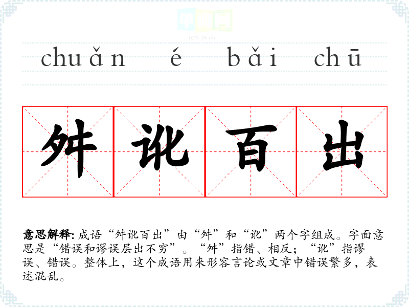 成语“舛讹百出”由“舛”和“讹”两个字组成。字面意思是“错误和谬误层出不穷”。“舛”指错、相反;“讹”指谬误、错误。整体上,这个成语用来形容言论或文章中错误繁多,表述混乱。