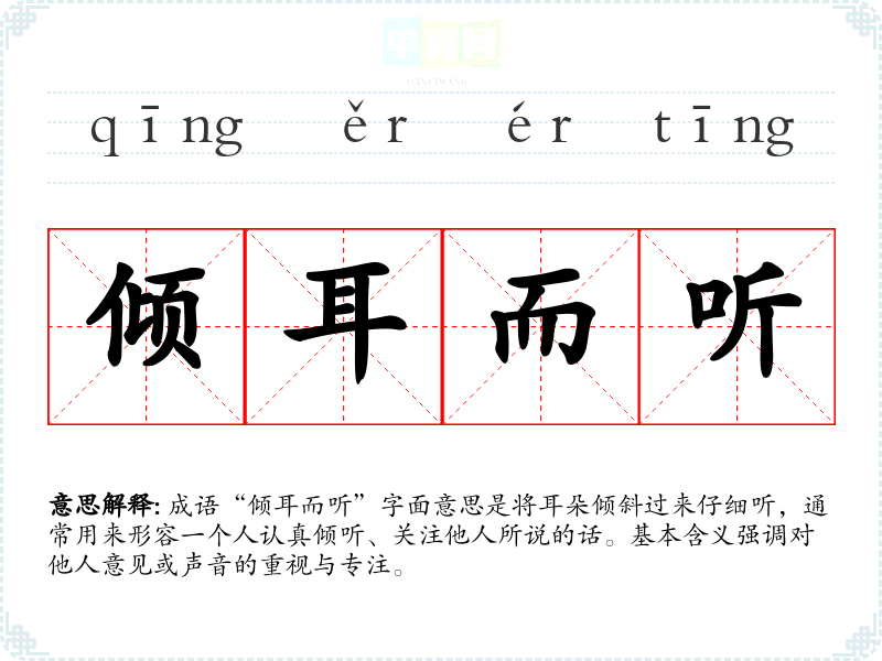 在我个人的生活中,我常常会用“倾耳而听”来提醒自己在与朋友交流时要更加专注。记得有一次,我的一个朋友遇到了困难,我认真倾听了她的烦恼,给了她一些建议,最终她感到很受鼓舞。这让我深刻体会到倾听的力量。