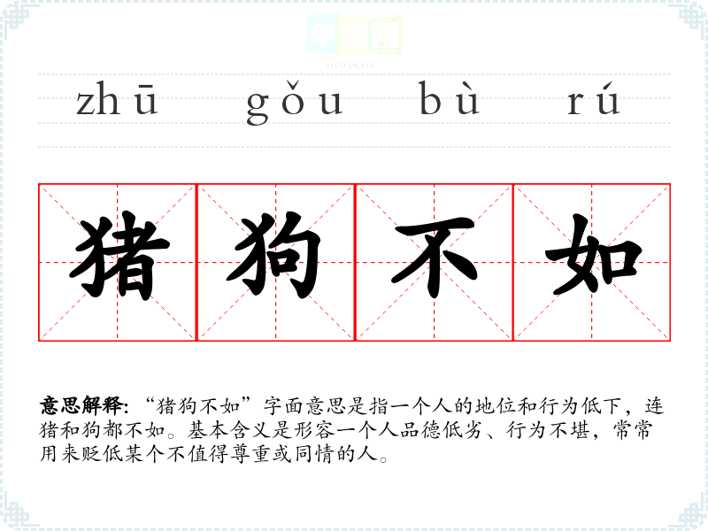 “猪狗不如”字面意思是指一个人的地位和行为低下,连猪和狗都不如。基本含义是形容一个人品德低劣、行为不堪,常常用来贬低某个不值得尊重或同情的人。