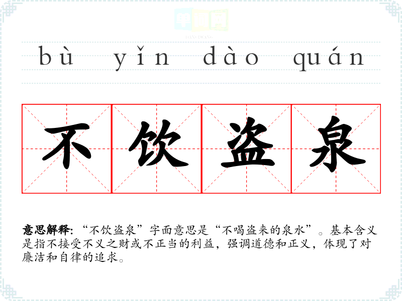“不饮盗泉”字面意思是“不喝盗来的泉水”。基本含义是指不接受不义之财或不正当的利益,强调道德和正义,体现了对廉洁和自律的追求。
