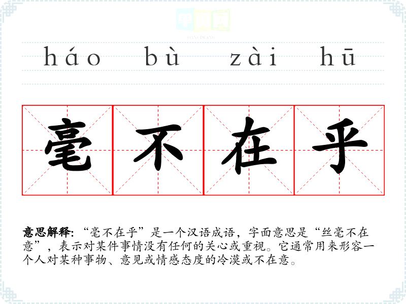 “毫不在乎”并没有明确的历史典故或文学出处,属于常用的口语表达。成语中的“毫”指的是极小的单位,强调微不足道;“不在乎”则表示缺乏关注或重视。结合起来,成语表达了一种对某事物的不屑和轻视。