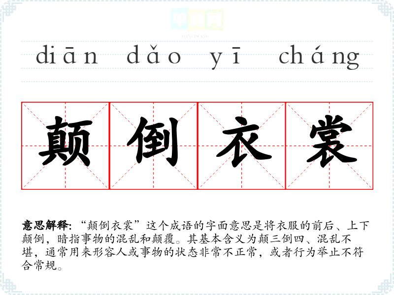 “颠倒衣裳”这个成语的字面意思是将衣服的前后、上下颠倒,暗指事物的混乱和颠覆。其基本含义为颠三倒四、混乱不堪,通常用来形容人或事物的状态非常不正常,或者行为举止不符合常规。