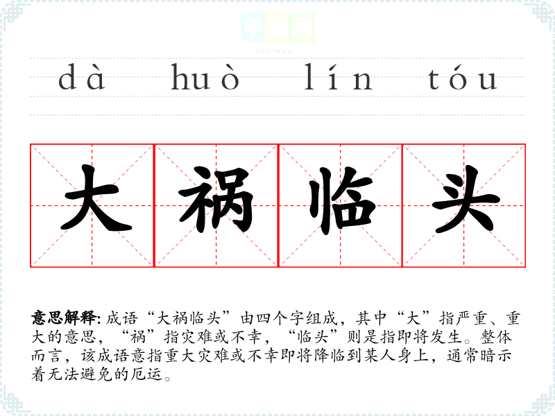 成语“大祸临头”由四个字组成,其中“大”指严重、重大的意思,“祸”指灾难或不幸,“临头”则是指即将发生。整体而言,该成语意指重大灾难或不幸即将降临到某人身上,通常暗示着无法避免的厄运。