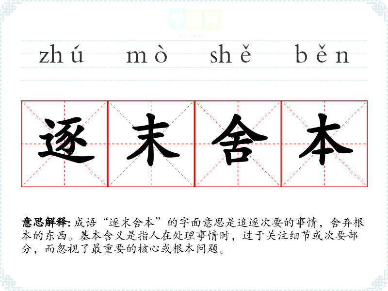 成语“逐末舍本”的字面意思是追逐次要的事情,舍弃根本的东西。基本含义是指人在处理事情时,过于关注细节或次要部分,而忽视了最重要的核心或根本问题。