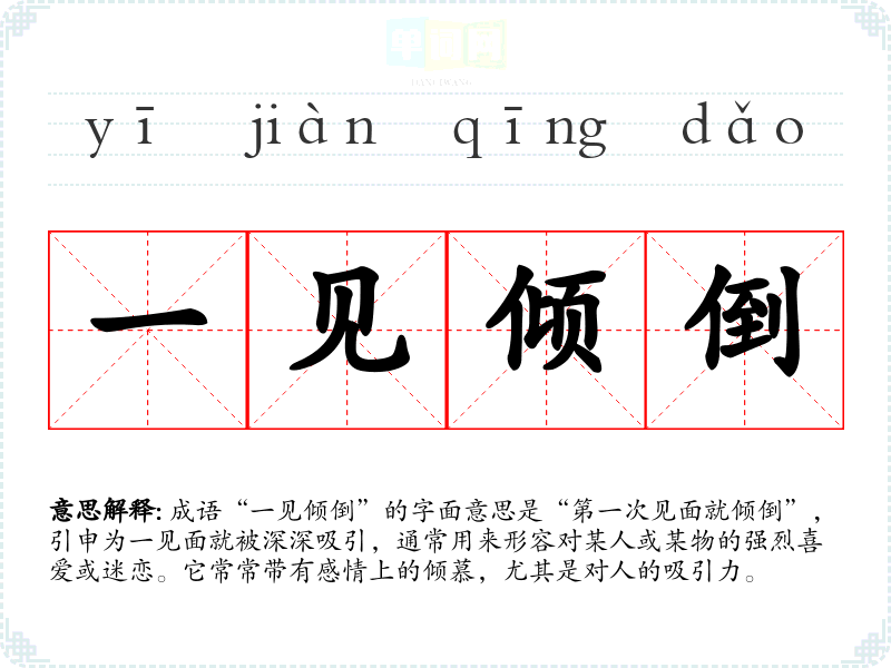 成语“一见倾倒”的字面意思是“第一次见面就倾倒”,引申为一见面就被深深吸引,通常用来形容对某人或某物的强烈喜爱或迷恋。它常常带有感情上的倾慕,尤其是对人的吸引力。