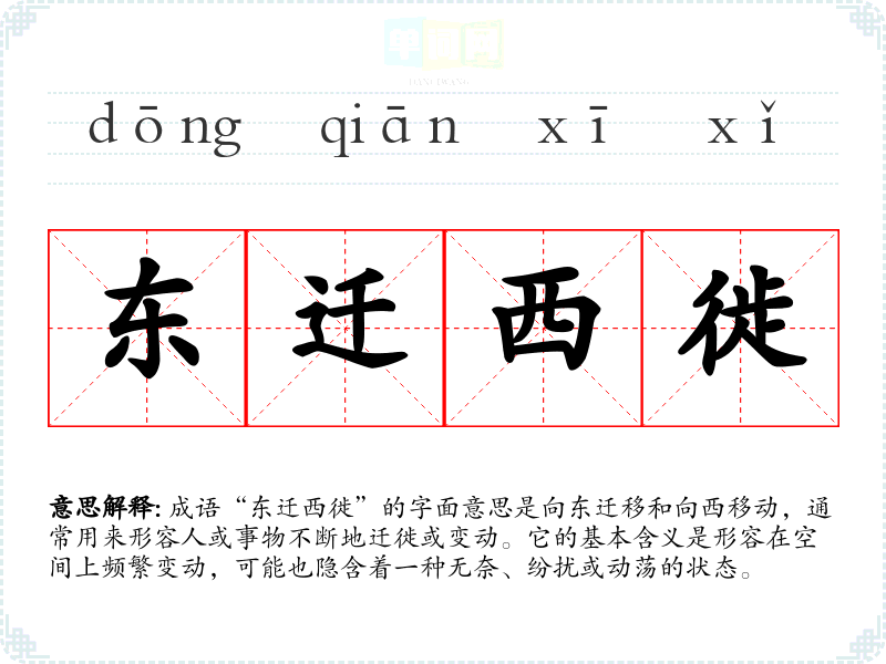 成语“东迁西徙”的字面意思是向东迁移和向西移动,通常用来形容人或事物不断地迁徙或变动。它的基本含义是形容在空间上频繁变动,可能也隐含着一种无奈、纷扰或动荡的状态。