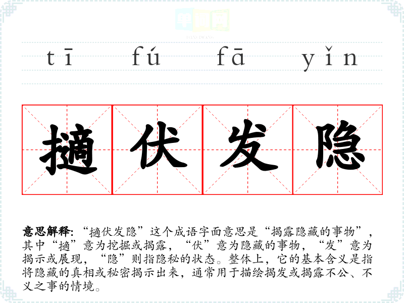 “擿伏发隐”这个成语字面意思是“揭露隐藏的事物”,其中“擿”意为挖掘或揭露,“伏”意为隐藏的事物,“发”意为揭示或展现,“隐”则指隐秘的状态。整体上,它的基本含义是指将隐藏的真相或秘密揭示出来,通常用于描绘揭发或揭露不公、不义之事的情境。
