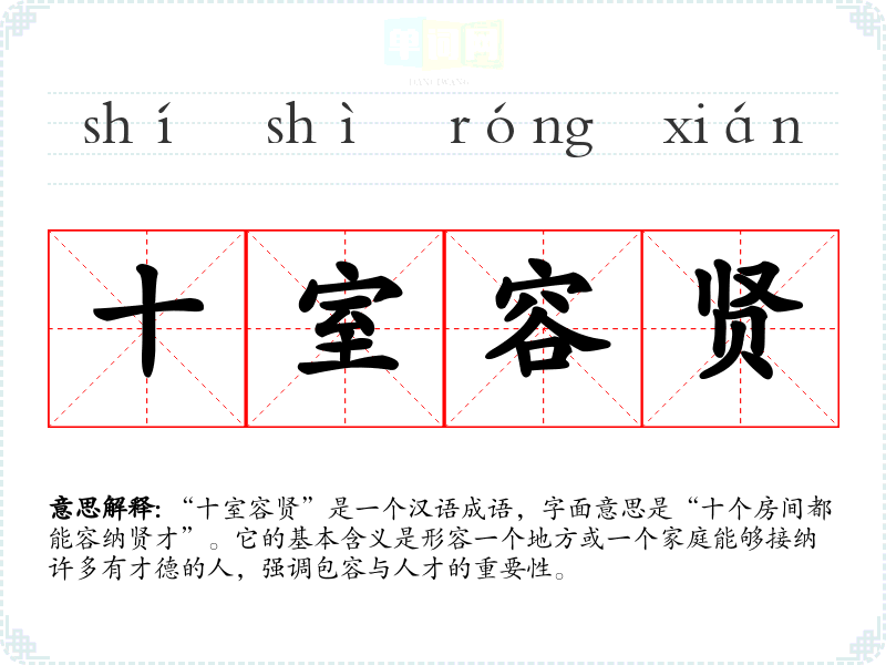 “十室容贤”是一个汉语成语,字面意思是“十个房间都能容纳贤才”。它的基本含义是形容一个地方或一个家庭能够接纳许多有才德的人,强调包容与人才的重要性。