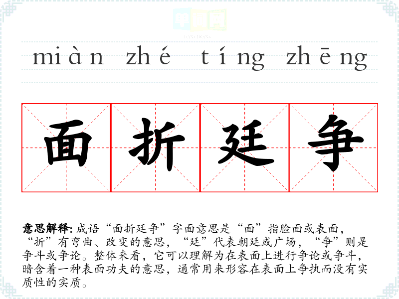 成语“面折廷争”字面意思是“面”指脸面或表面,“折”有弯曲、改变的意思,“廷”代表朝廷或广场,“争”则是争斗或争论。整体来看,它可以理解为在表面上进行争论或争斗,暗含着一种表面功夫的意思,通常用来形容在表面上争执而没有实质性的实质。