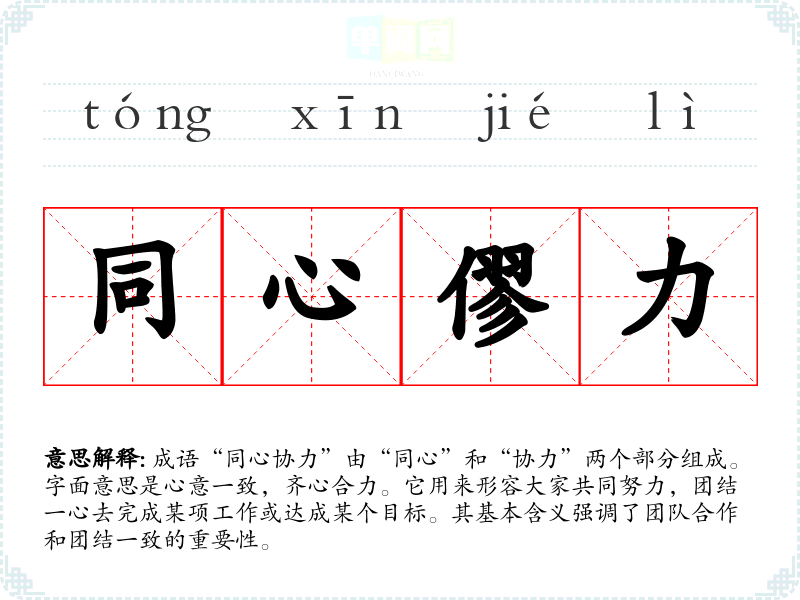 成语“同心协力”由“同心”和“协力”两个部分组成。字面意思是心意一致,齐心合力。它用来形容大家共同努力,团结一心去完成某项工作或达成某个目标。其基本含义强调了团队合作和团结一致的重要性。